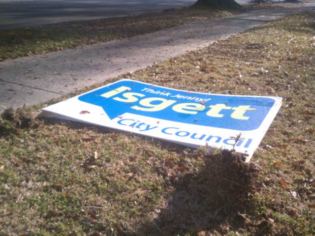 I really don't care who ends up on  City Council that much. It's not really that big of a deal. I have strong feeling about the penny sales tax, on general principle, but it's not worth pulling up signs. Nothing is. It's just a sign.